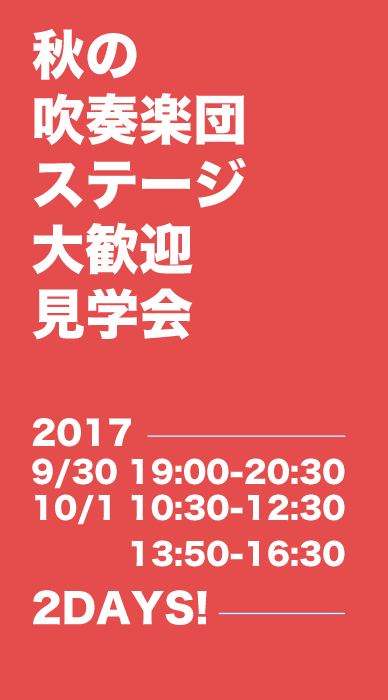秋の「大歓迎見学会」では、吹奏楽団ステージの今後のイベントでの演奏曲「センチュリア」「風紋 - 1987年 吹奏楽コンクール課題曲」を一緒に合奏して頂けるように準備してお待ち致しております。